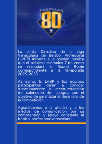 La Liga Venezolana de Béisbol Profesional (LVBP) indicó este domingo que las acciones del Round Robin se retomarán el próximo miércoles 7 de enero.