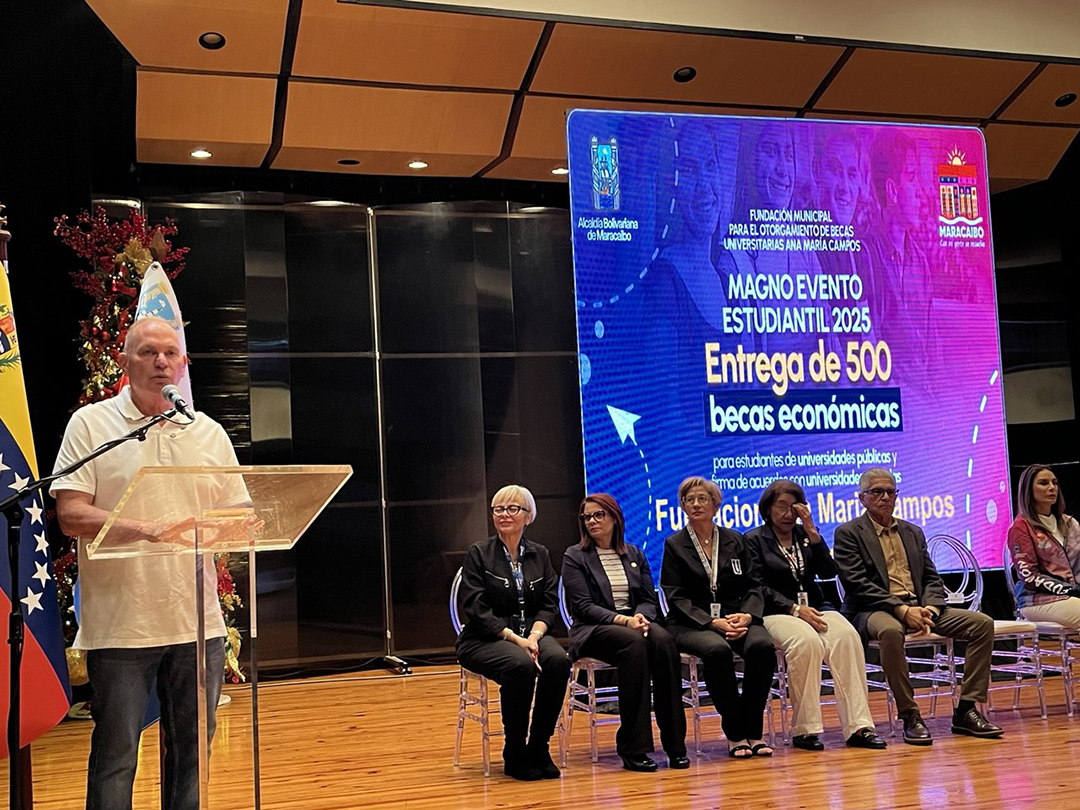 El alcalde de Maracaibo, Gian Carlo Di Martino, entregó este martes 500 beneficios económicos a un grupo de estudiantes del programa de becas Ana María Campos. Estas ayudas servirán para que los becarios costeen el material o cualquier otra cosa que necesiten mientras cursan sus respectivas carreras universitarias.