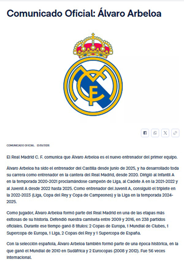 «El Real Madrid CF comunica que Álvaro Arbeloa es el nuevo entrenador del primer equipo», anunció el club blanco en un comunicado.4