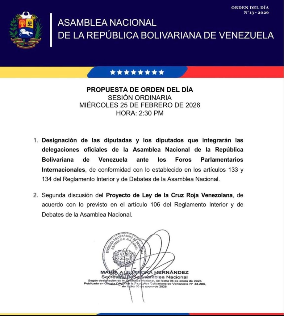 Según detalla Unión Radio, en el orden del día presentado por la AN, también se llevará a cabo la segunda discusión del Proyecto de Ley de la Cruz Roja Venezolana.