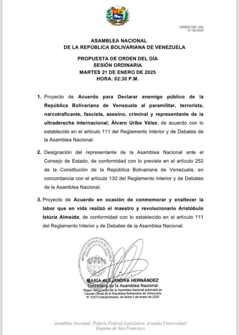 Este martes 21 de enero la Asamblea Nacional (AN) discutirá el proyecto de acuerdo para declarar como «enemigo público» de Venezuela al expresidente colombiano, Álvaro Uribe Vélez, quien pidió contra la nación una intervención militar donde pretendían dar un golpe de Estado al presidente de la República, Nicolás Maduro, tras su juramentación como presidente constitucional para el periodo 2025-2031.