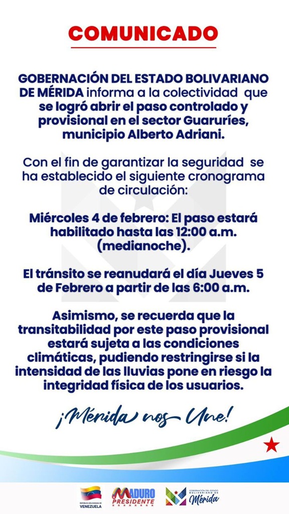 La gobernación del estado Mérida informó que fue habilitado un paso provisional en el sector Guaruríes, municipio Alberto Adriani, con el fin de garantizar la seguridad de los ciudadanos.