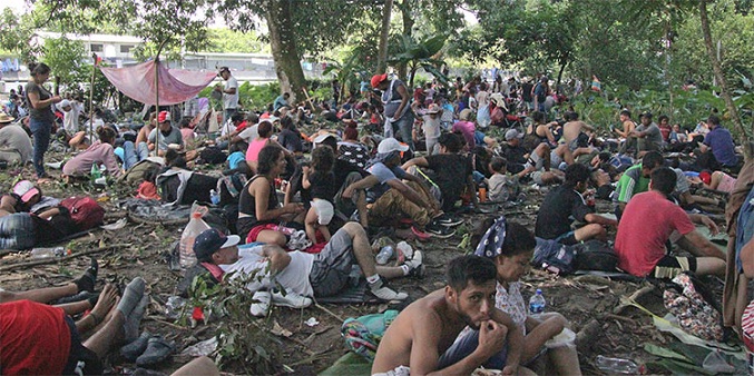 La caravana, conformada por unos 4.000 migrantes, en su mayoría centroamericanos y haitianos, hizo una escala en el municipio de Huixtla, para descansar, curarse las heridas tras cuatro días de viaje e hidratarse, reseña EFE.