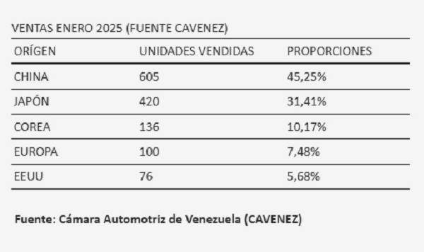 De los mil 337 vehículos que se vendieron en el país en enero de este año, el 45,25 por ciento provienen de fabricantes chinos, es decir, 605 automóviles, indica un informe de ventas de la Cámara Automotriz de Venezuela (Cavenez).