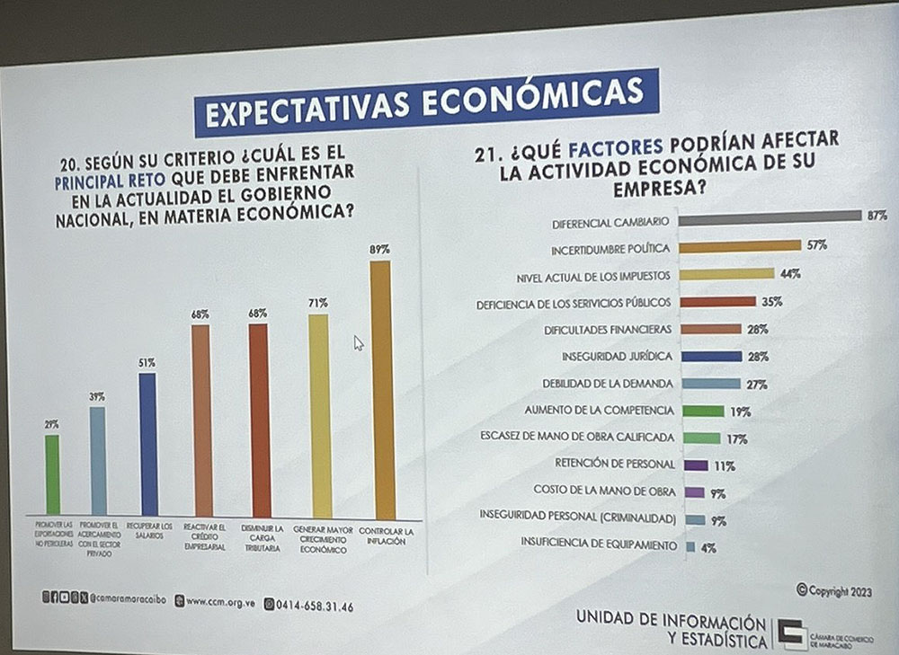 La encuesta también precisa que, a pesar del optimismo del sector privado, persisten, aún, desafíos estructurales que limitan su desarrollo pleno; entre los más relevantes se destacan el diferencial cambiario (87 %), la incertidumbre política (57 %) y el nivel actual de los impuestos (44 %), factores que continúan incidiendo en la competitividad y sostenibilidad de las empresas marabinas.