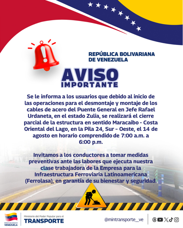 El tráfico vehicular por el puente sobre el lago de Maracaibo se verá relativamente afectado este jueves 14 de agosto por el cierre parcial determinado por el Ministerio del Poder Popular para el Transporte que inició el reemplazo de algunos cables de acero de la estructura.