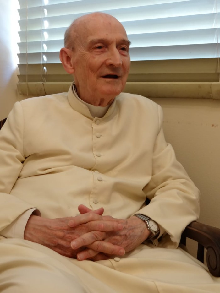 Un año después de su ordenación dijo que se ofreció a venir a nuestro país como voluntario a evangelizar en esta parte del mundo, donde su destino sacerdotal, aún muy jóven, lo trajo a Maiquetía hace 61 años. Su parecido físico, –a lo lejos en su caminar y por los efectos de una avanzada escoliosis–, me recordó ver en persona al inolvidable Papa Juan Pablo II.