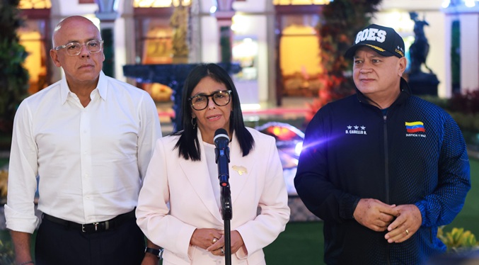 Rodríguez ofreció declaraciones desde el Palacio de Miraflores a un mes de los acontecimientos sucedidos el 3 de enero, y estuvo acompañada por el presidente de la Asamblea Nacional, Jorge Rodríguez, y el ministro de Interior, Diosdado Cabello.