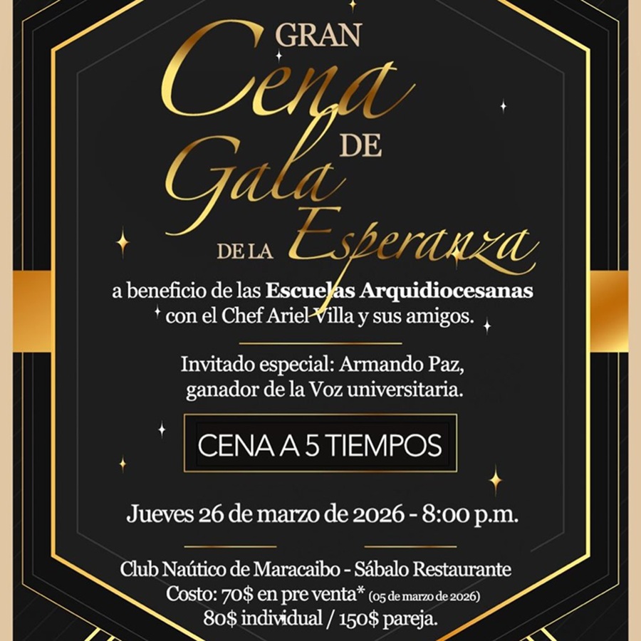 La gran cena de la esperanza para las Escuelas Arquidiocesanas se realizará en el Restaurant el Sábalo del Club Náutico de Maracaibo, jueves 26 de marzo a las 8.00 de la noche.