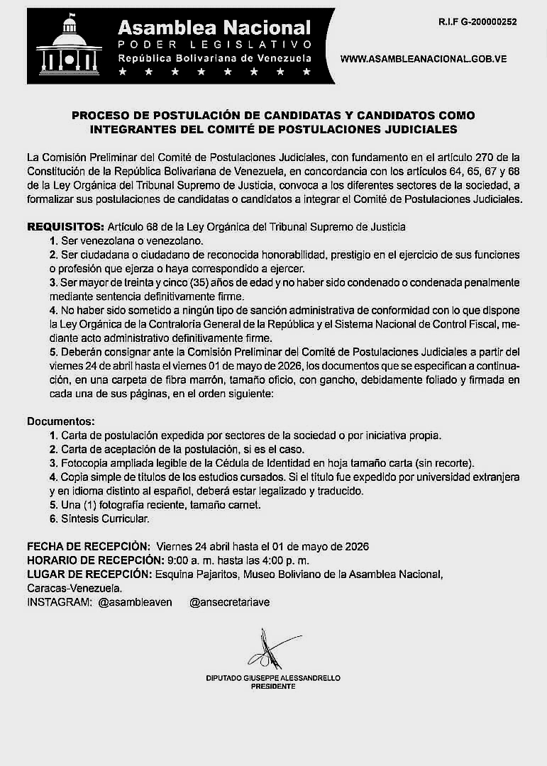 La Asamblea Nacional (AN) anunció los requisitos que deben presentar los ciudadanos para formalizar su inscripción como candidatos para integrar el Comité de Postulaciones Judiciales, que comenzó este viernes y que se extenderá hasta la próxima semana.