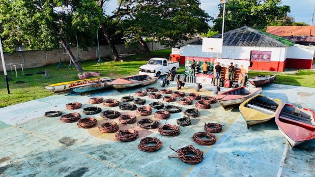 De igual manera en el lugar de los hechos se hallaron un equipo de oxicorte, una romana electrónica, 7 lancha tipo peñero y 4 motores fuera de borda. Además de una camioneta y una moto, 2 teléfonos con información de interés criminalístico, 200 litros de gasolina en 3 envases, 2 máquinas de soldaduras, 3 cizallas manuales de corte, 3 seguetas para corte de metal y ocho bombonas de oxígenos.