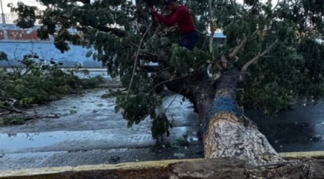 Tras los fuertes vientos que también se registraron durante las lluvias, un árbol se vino abjao en la avenida Independencia, lo que limitó por unos minutos el tránsito vehicular por esa arteria vial, hasta que fue removido por funcionarios de Protección Civil.