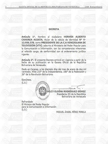 La presidenta encargada de la República, Delcy Rodríguez, designó al periodista Hernán Canorea como nuevo presidente de Venezolana de Televisión (VTV), de acuerdo al decreto N.º 5.216 publicados en la Gaceta Oficial N.º 6.969 que entró en vigencia el pasado viernes 16 de enero.