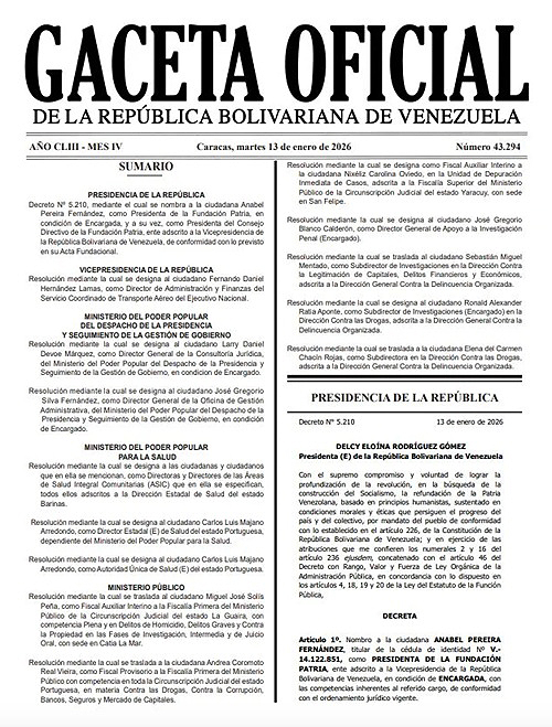 Asimismo, mediante el decreto N° 5.210 anunciado en la Gaceta Oficial N° 43.294, la mandatario nombró a Anabel Pereira Fernández como presidenta encargada de la Fundación Patria y presidenta del respectivo Consejo Directivo. Esta unidad está adscrita a la Vicepresidencia de la República y su estructura está definida en su acta fundacional.