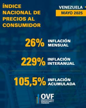 El Observatorio Venezolano de Finanzas (OVF) informó que la tasa de inflación en mayo de 2025, registró un aumento al ubicarse en 26 %, muy superior a la cifra de abril, cuando alcanzó 18,4 %.