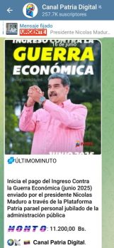 «Monedero Patria: Crédito por Bs. 11.200 por concepto de bono Contra la Guerra Económica (junio de 2025)», puntualizó el mensaje que reciben los beneficiarios.