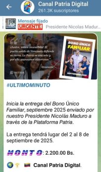 Este martes 2 de septiembre de 2025, el Ejecutivo nacional inició la entrega del Bono Único Familiar, correspondiente al mes en curso, a través de la Plataforma Patria.