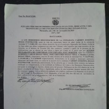 El Juzgado Tercero de Primera Instancia en lo Civil, Mercantil y del Tránsito de la Circunscripción Judicial del Estado Zulia emitió una notificación a los herederos desconocidos de la fallecida ciudadana Carmen Josefina Rojas Fuenmayor para que comparezcan ante este organismo.