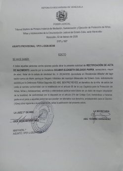 El Juzgado Séptimo de Primera Instancia, Sustanciación y Ejecución de Protección de Niños, Niñas y Adolescentes de la Circunscripción Judicial del Estado Zulia emitió una rectificación de acta de nacimiento.