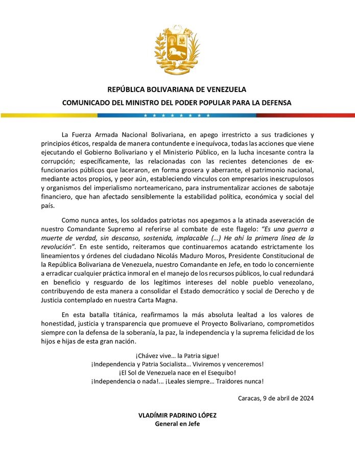 «La Fuerza Armada Nacional Bolivariana, en apego irrestricto a sus tradiciones y principios éticos, respalda de manera contundente e inequívoca, todas las acciones que viene ejecutando el Gobierno Bolivariano y el Ministerio Público, en la lucha incesante contra la corrupción; específicamente, las relacionadas con las recientes detenciones de ex- funcionarios públicos que laceraron, en forma grosera y aberrante, el patrimonio nacional, mediante actos propios, y peor aún, estableciendo vínculos con empresarios inescrupulosos y organismos del imperialismo norteamericano, para instrumentalizar acciones de sabotaje financiero, que han afectado sensiblemente la estabilidad política, económica y social del país», detalla el comunicado.