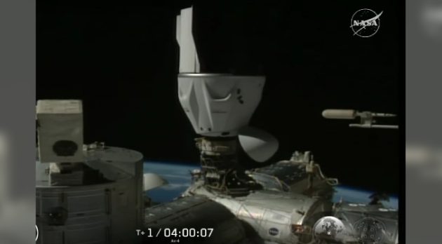 «La nave espacial Dragon se acopló con la @Space_Station a las 6:31am ET (1031 UTC)«, informó la Agencia Espacial Estadounidense (NASA).