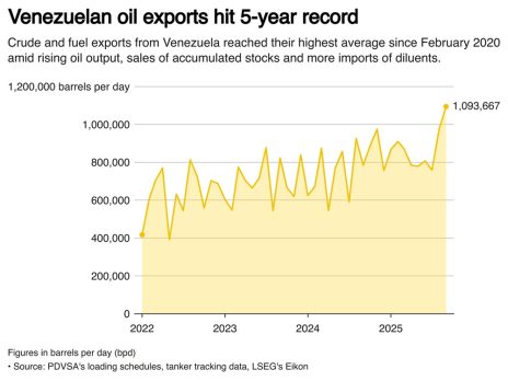 Las exportaciones de petróleo de Venezuela promediaron 1,09 millones de barriles por día (bpd) en septiembre, el nivel mensual más alto desde febrero de 2020, según datos de envío y documentos de la estatal energética PDVSA.