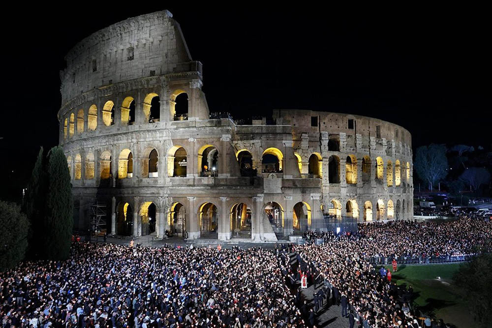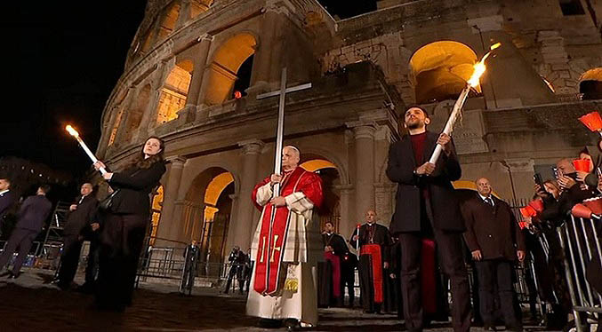 El rito, que rememora el calvario de Jesús desde su condena a muerte hasta su sepultura, comenzó en el interior del Anfiteatro Flavio, símbolo del martirio de los primeros cristianos.
