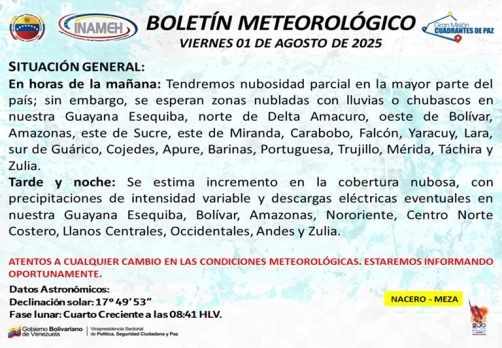 Este viernes 1 de agosto en horas de la mañana habrá nubosidad parcial en la mayor parte del país; sin embargo, se esperan zonas nubladas con lluvias o chubascos en la Guayana Esequiba, norte de Delta Amacuro, oeste de Bolívar, Amazonas, este de Sucre, este de Miranda, Carabobo, Falcón, Yaracuy, Lara, sur de Guárico, Cojedes, Apure, Barinas, Portuguesa, Trujillo, Mérida, Táchira y Zulia, informó el boletín del Instituto Nacional de Meteorología e Hidrología (Inameh).
