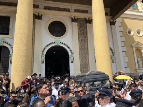 Cumplido el protocolo, los restos mortales fueron sacados en hombro por un grupo de Servidores de María que lo condujeron hasta la Plazoleta donde se encontraban sobre la tarima el grupo Los Chiquinquireños.