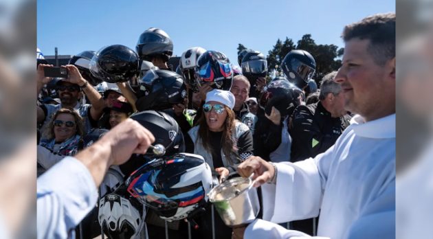 Pero el punto culminante de la concentración fue la bendición, cuando los sacerdotes caminaron entre el mar de peregrinos vestidos de cuero y rociaron agua bendita sobre los cascos sostenidos en alto.
