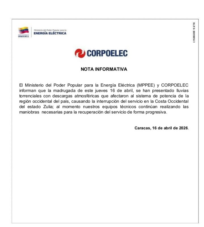 El ministerio de Energía Eléctrica y la Corporación Electrica Nacional (Corpoelec) señalaron que la situación de corte generalizado del servicio en el occidente de Zulia se debió a las fuertes precipitaciones que «afectaron al sistema de potencia de la región«.