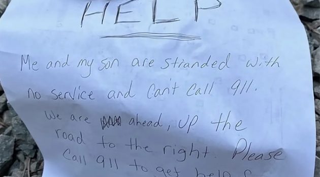 En la tarde del sábado, un equipo de búsqueda localizó una nota manuscrita puesta en la intersección de una carretera remota del Servicio Forestal de EEUU.