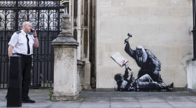 Un nuevo mural del esquivo artista callejero Banksy, que muestra a un juez golpeando a un manifestante desarmado con un mazo será retirado de una pared fuera de uno de los tribunales más emblemáticos de Londres, dijeron las autoridades el lunes.