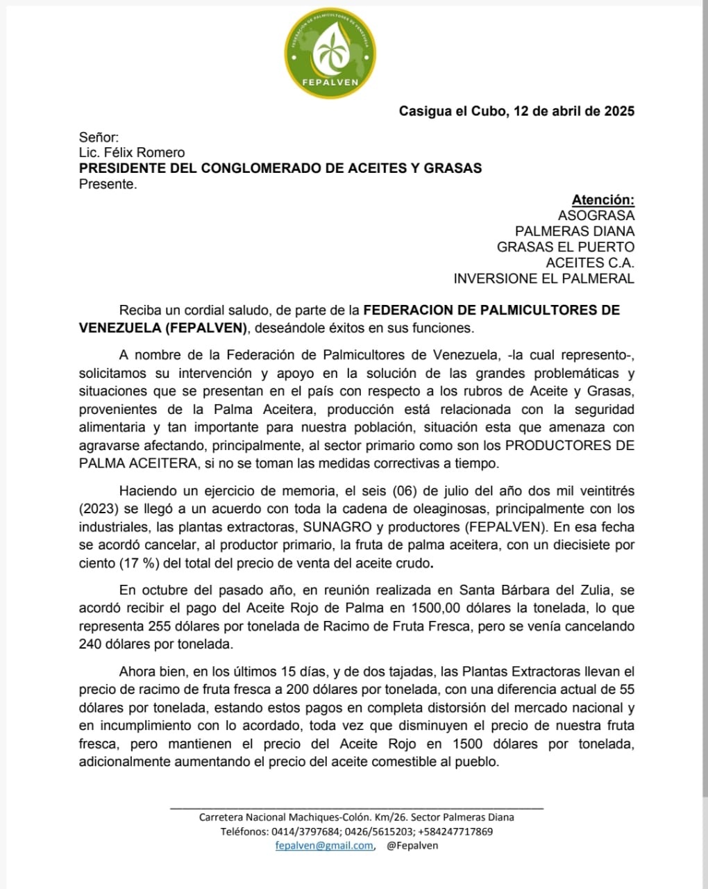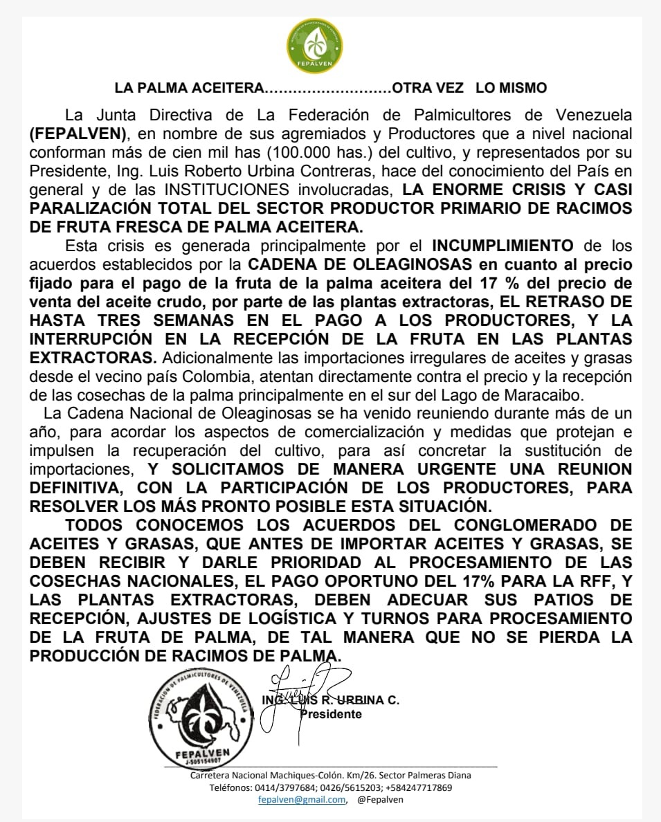 La Federación de Palmicultores de Venezuela (Fepalven), alzando la voz en representación de sus numerosos agremiados y los productores que a lo largo y ancho del territorio nacional cultivan más de cien mil hectáreas de palma aceitera, ha emitido una contundente alerta sobre la profunda crisis que amenaza con paralizar por completo la producción primaria de racimos de fruta fresca (RFF) de palma aceitera en el país.