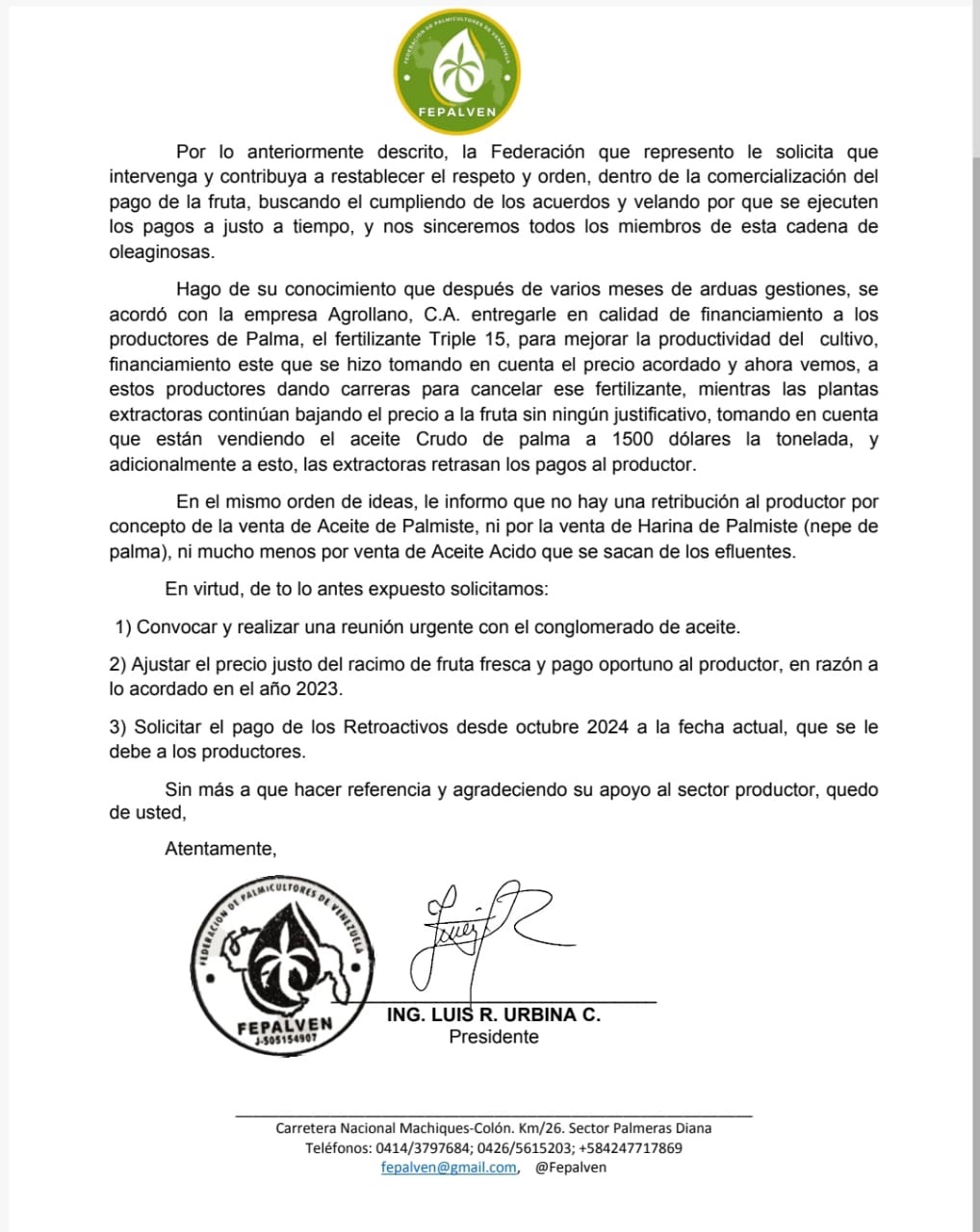 En este contexto de creciente incertidumbre y dificultades operativas, Fepalven hace un llamado urgente a las instituciones competentes para que convoquen a una reunión definitiva, en la que participen activamente los productores, quienes son los principales afectados por esta crisis. La federación insiste en la necesidad de abordar y resolver de manera expedita los problemas que amenazan la viabilidad del sector palmicultor venezolano.