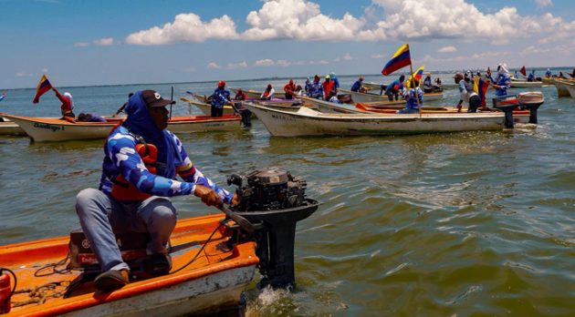 El pueblo pescador del Zulia, en sus pequeñas embarcaciones de faena, escenificó una marcha lacustre en el Lago de Maracaibo junto a su gobernador Luis Caldera, la Fuerza Armada Nacional Bolivariana (FANB) acantonada en la entidad y comunas pesqueras, para elevar su voz y levantar la bandera nacional en defensa de la soberanía, la paz y el derecho de los venezolanos a existir como nación independiente.