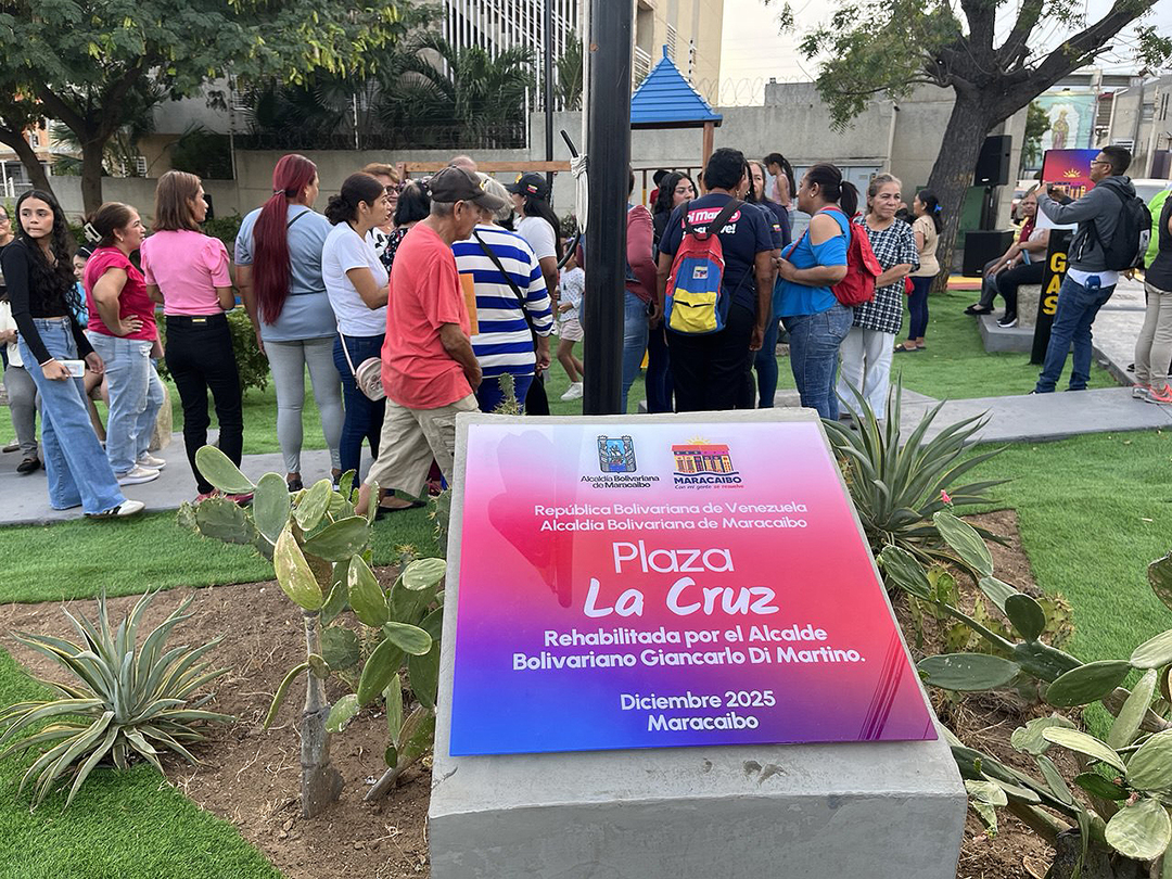 La alcaldía de Maracaibo reinauguró este viernes plaza La Cruz, en la calle 71, para el beneficio y el disfrute de todos los habitantes del sector Santa María en la parroquia Chiquinquirá. El acto fue encabezado por el Gian Carlo Di Martino, jefe del Ejecutivo municipal, quien estuvo acompañado de Dessiree Fernández, presidenta del Concejo Municipal de la ciudad.