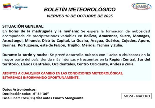 Este viernes en horas de la mañana se espera la formación de nubosidad acompañada de precipitaciones variables en Bolívar, Amazonas, Sucre, Monagas, Anzoátegui, Miranda, Distrito Capital, La Guaira, Aragua, Guárico, Cojedes, Apure, Barinas, Portuguesa, este de Falcón, Trujillo, Mérida, Táchira y Zulia, reseña el boletín del Instituto Nacional de Meteorología e Hidrología (Inameh).