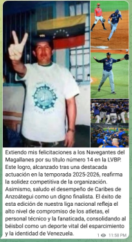 «Este logro, alcanzado tras una destacada actuación en la temporada 2025-2026, reafirma la solidez competitiva de la organización. Asimismo, saludo el desempeño de Caribes de Anzoátegui como un digno finalista«, expresó Rodríguez a través de un mensaje publicado en su canal Telegram, indica la nota de El Universal.