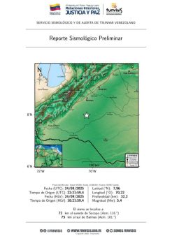 Este miércoles 24 de septiembre, aproximadamente a las 6:21 de la tarde se registró un sismo de 5.4 de magnitud en el estado Zulia, al sureste de Socopo, a 75 km al sur de Barinas, según datos aportados por la Fundación Venezolana de Investigaciones Sismológicas (FUNVISIS).