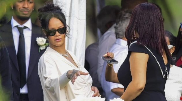 Rihanna estuvo presente en la ceremonia que se realizó al aire libre. Estuvo acompañada de sus nueve hermanos, de su pareja A$AP Rocky, de sus dos hijos y de sus sobrinos.