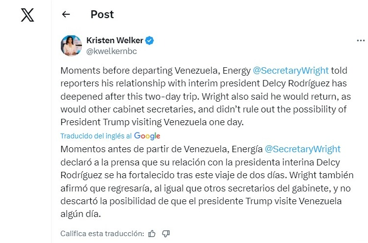 El secretario de Energía de Estados Unidos, Christopher Wright, expresó la noche de este jueves, que la relación con la presidenta encargada, Delcy Rodríguez, se fortaleció tras el encuentro que sostuvieron durante su viaje de dos días.