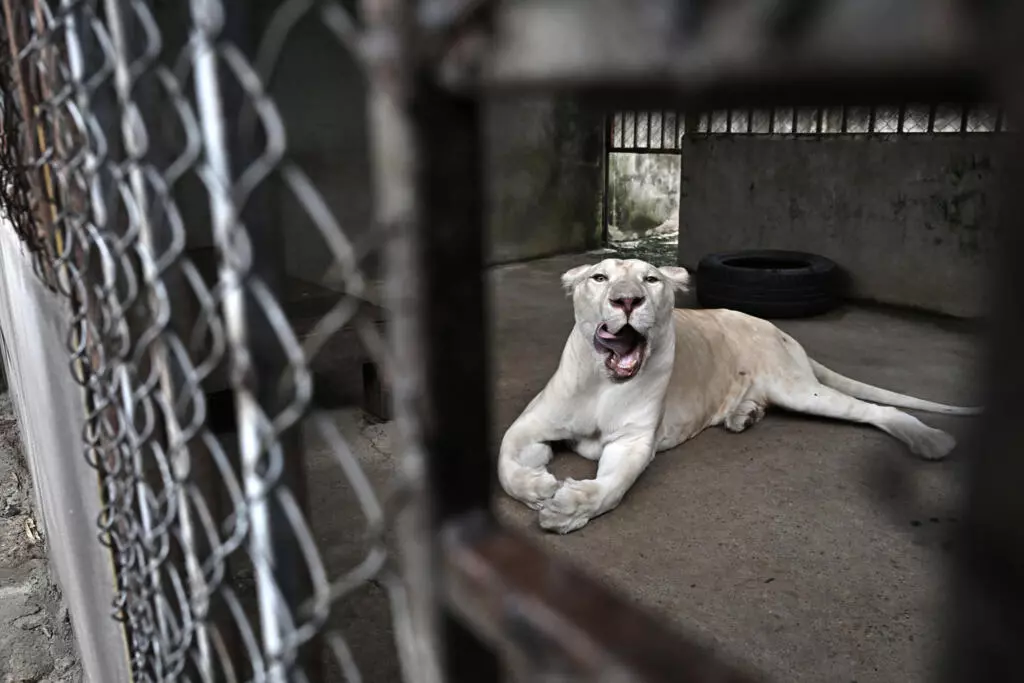 Detrás de su garaje, en una calle como tantas otras de Chiang Mai, en el norte de Tailandia, Tharnuwarht Plengkemratch instaló dos leonas blancas y un híbrido de león y tigre de 200 kilos llamado «Big George«, sus mascotas.