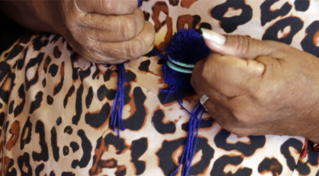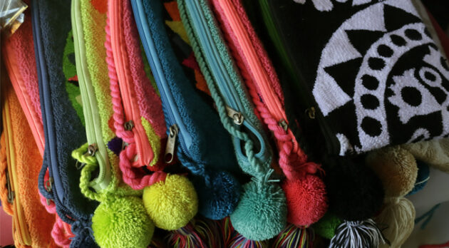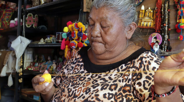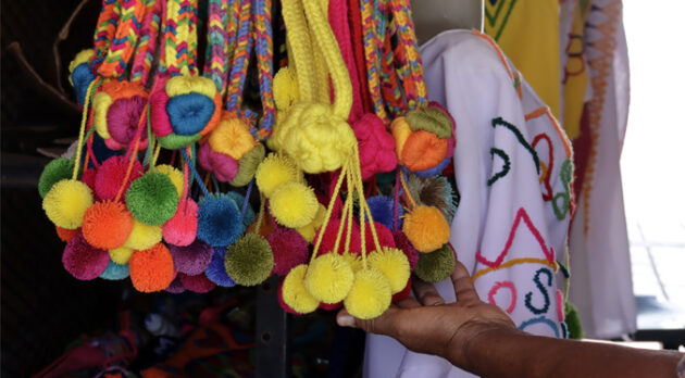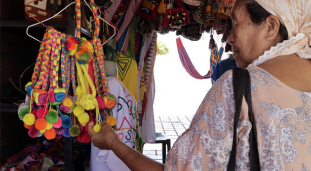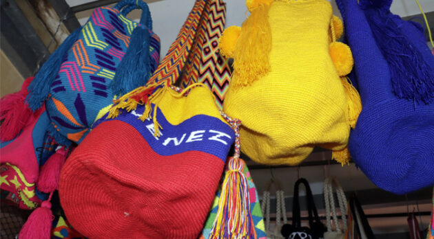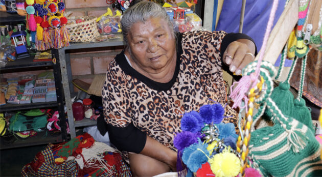 “Yo tengo años trabajando haciendo llaveros, haciendo las mochilas, todo esto lo hacemos nosotros, esto no es de fábrica, la máquina son nuestras manos (…) Nuestra abuela fue quien nos enseñó a hacer esto, yo tenía como ocho o siete años, yo vendía en los ferris, desde aquí de Maracaibo a Palmarejo. Para nosotros saber tejer es un orgullo” expresó la señora Olga Perozo, quien tiene más de 50 años vendiendo gran variedad de artesanías en el Mercado wayuu San Sebastián, ubicado en la avenida El Milagro, en la ciudad de Maracaibo.