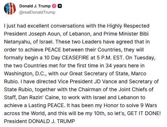 «Acabo de mantener excelentes conversaciones con el muy respetado presidente Joseph Aoun, del Líbano, y con el primer ministro Bibi Netanyahu, de Israel. Estos dos líderes han acordado que, para lograr la PAZ entre sus países, iniciarán formalmente un alto el fuego de 10 días a las 5:00 p.m. EST«, escribió Trump en su red Truth Social, indica la nota de EFE.