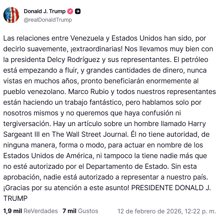 En el mismo mensaje, Trump apuntó que las relaciones entre Venezuela y Estados Unidos desde la captura de Nicolás Maduro el 3 de enero son «extraordinarias» y que se lleva «muy bien» con la presidenta encargada venezolana, Delcy Rodríguez.