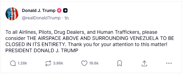 “A todas las aerolíneas, pilotos, narcotraficantes y traficantes de personas: les rogamos que consideren que el espacio aéreo sobre Venezuela y sus alrededores permanecerá cerrado en su totalidad”, dijo el presidente estadounidense en su plataforma Truth Social, expone la nota de Europa Press.