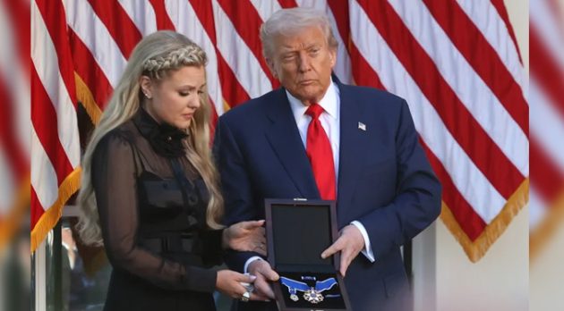La medalla fue recibida por la viuda de Kirk, Erika Kirk, a quien Trump describió como «una mujer de inspiración, bella y hermosa» y le dijo que su esposo «se sacrificó por el país».