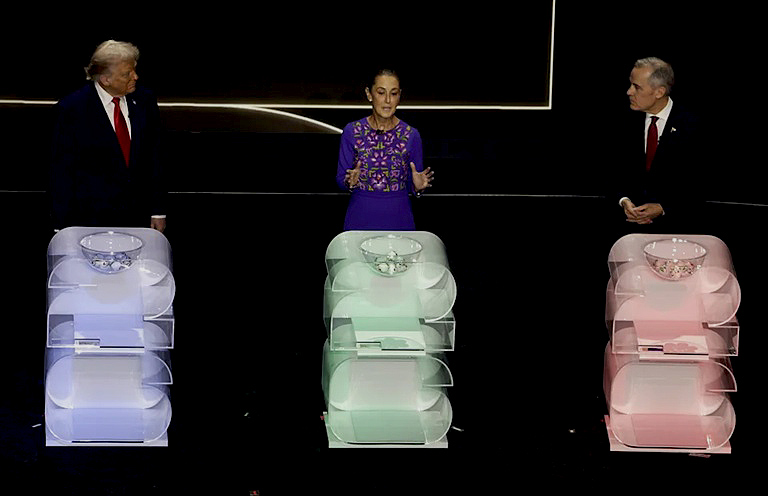 Trump, Sheinbaum y el primer ministro canadiense, Mark Carney, líderes de los tres países anfitriones del torneo, subieron al escenario y se situaron en diferentes podios para sacar las primeras bolas del sorteo.