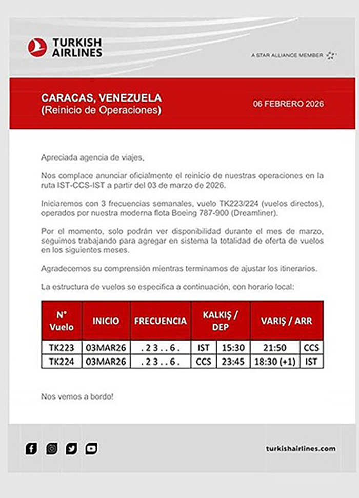 La aerolínea Turkish anunció este viernes que reanudará sus operaciones en la ruta Estambul-Caracas-Estambul desde el próximo 3 de marzo.